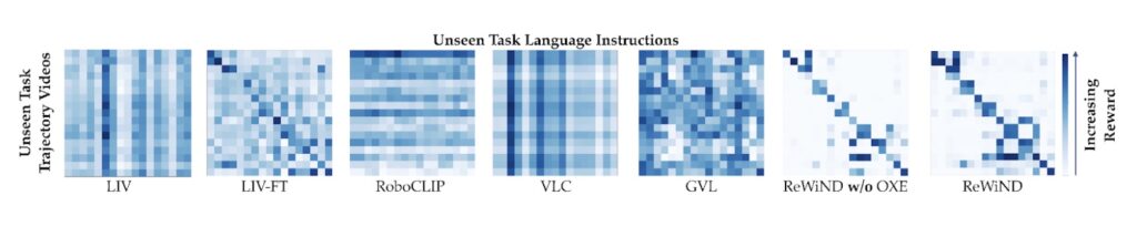 We compare ReWiND to LIV[1], LIV-FT, RoboCLIP[2], VLC[3], and GVL[4]. For generalization to unseen tasks, we use video–language confusion matrices. We feed the reward model video sequences paired with different language instructions and expect the correctly matched video–instruction pairs to receive the highest predicted rewards. In the confusion matrix, this corresponds to the diagonal entries having the strongest (darkest) values, indicating that the reward function reliably identifies the correct task description even for unseen tasks.